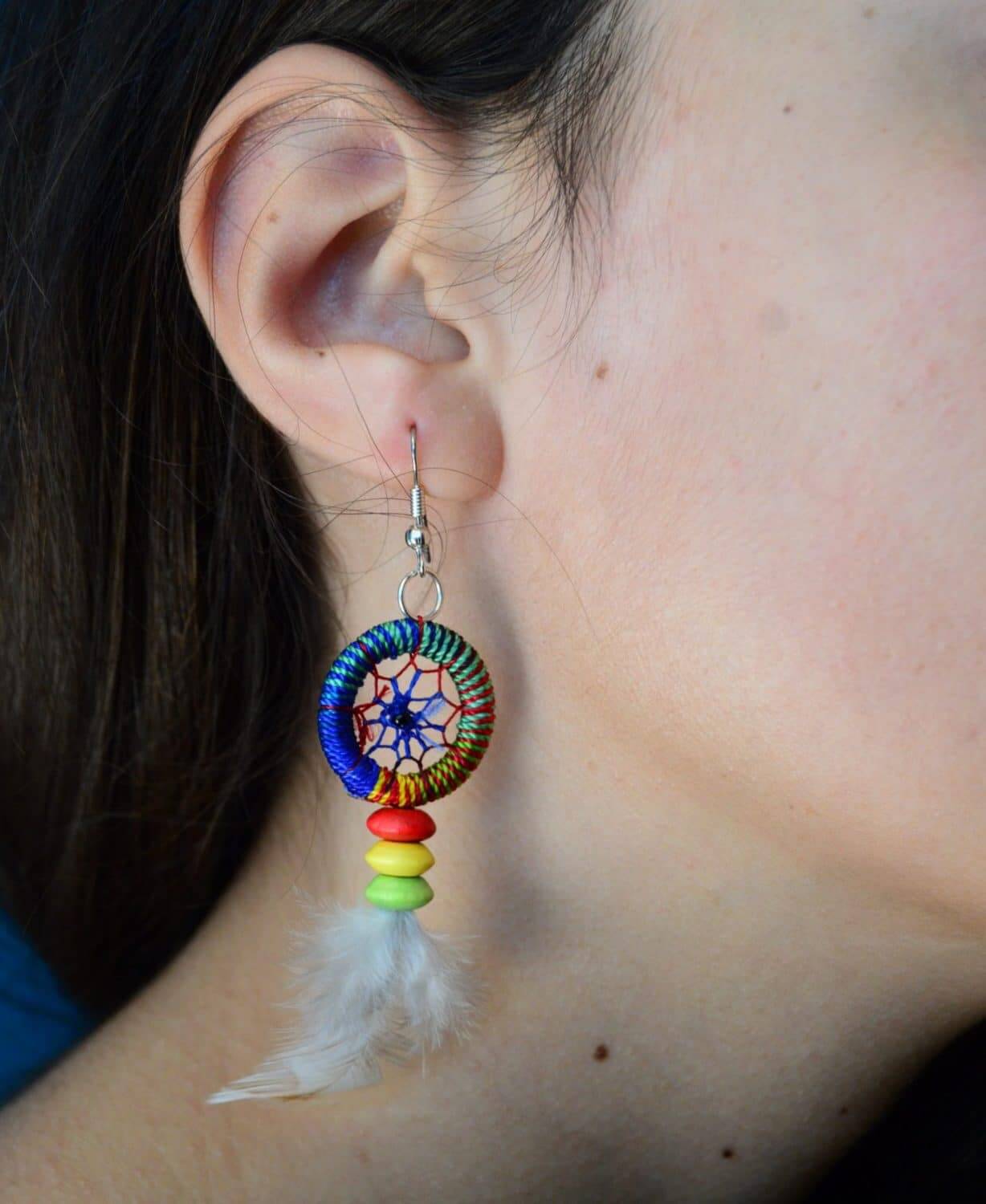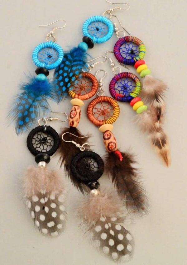 Beautiful dream catcher earrings made with leather, plastic beads, and feathers. Pack of 6 assorted colors.