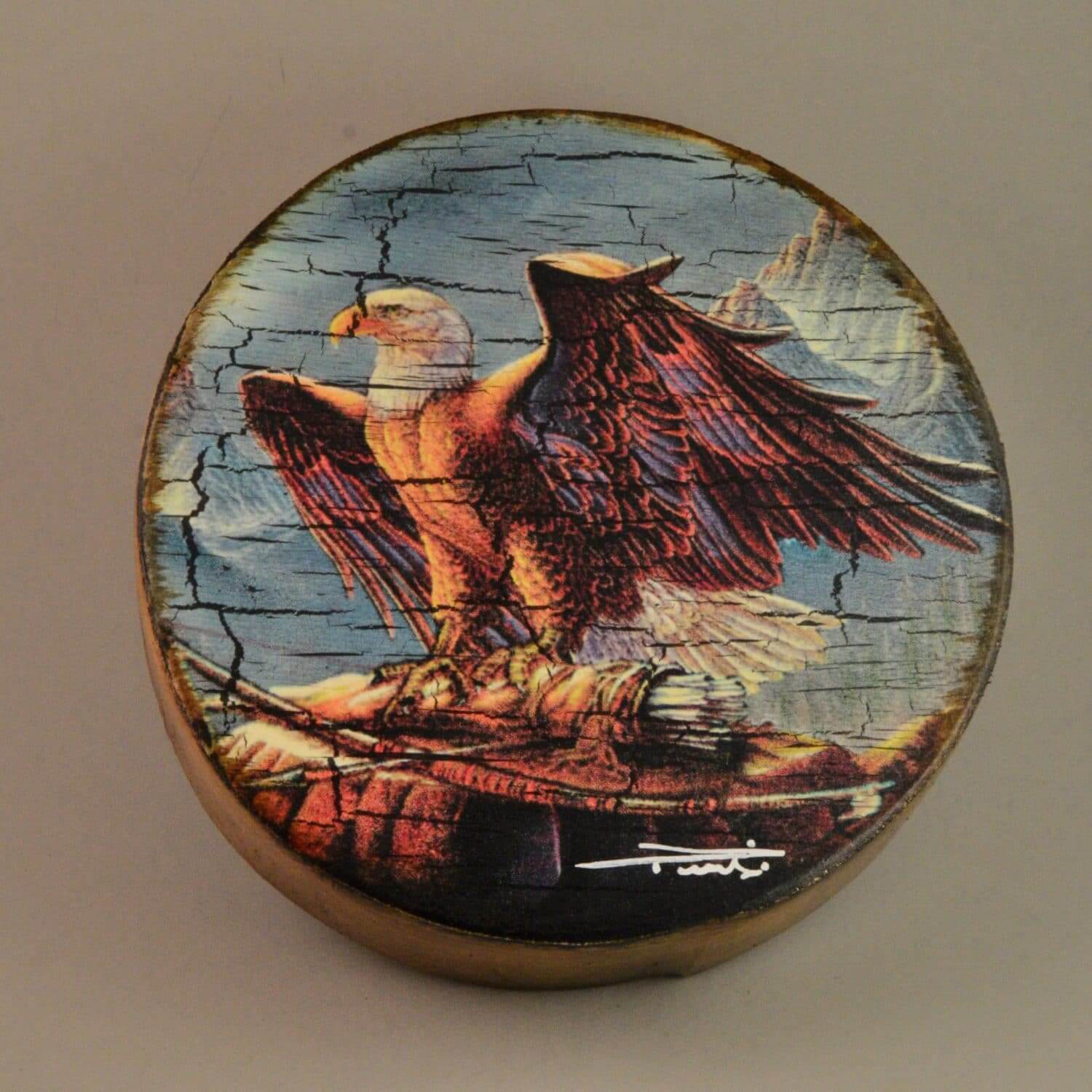 Eagle hand painted on a rawhide drum with crackled detailing.