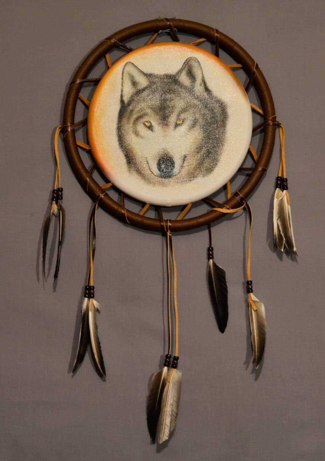 Wolf Face hand painted on canvas. Features a leather frame and lacing, duck feathers, and plastic beads.