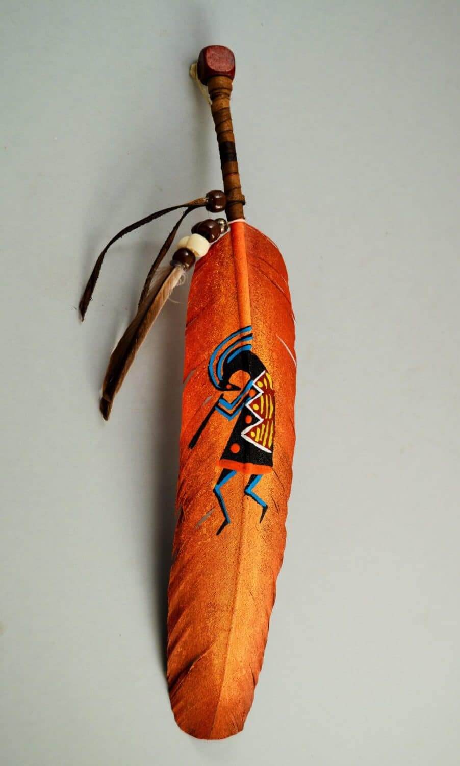 Hand painted Kokopelli on turkey feather with leather, plastic beads, and duck feathers. Read our blog post, The Legend of Kokopelli.
