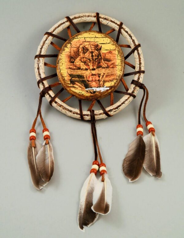 Wolf reflection painted on canvas with crackled detailing. Features leather lacing, duck feathers, and plastic beads.