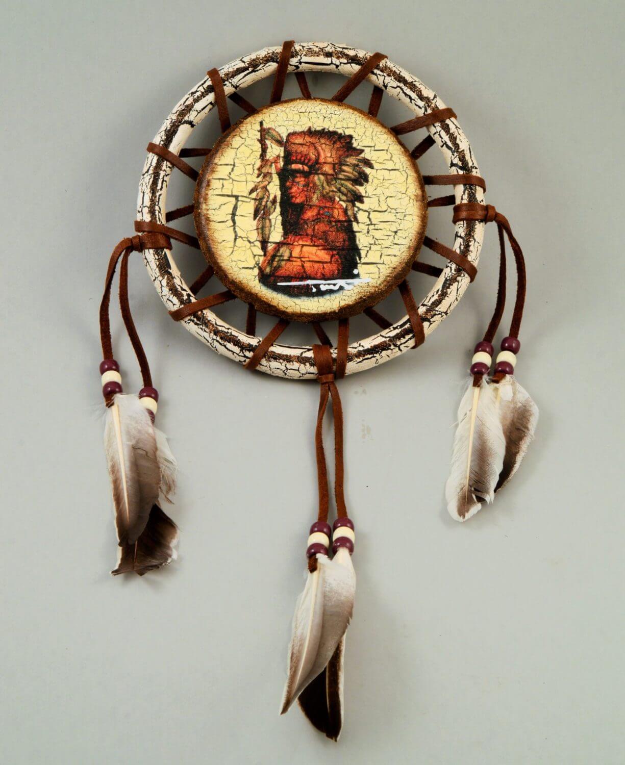 Native American Headdress painted on canvas with crackled detailing. Features leather lacing, duck feathers, and plastic beads.