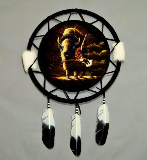 Buffalo and Eagle hand painted velvet shield features velvet rim, rabbit fur, leather lacing, plastic beads, and turkey feathers.