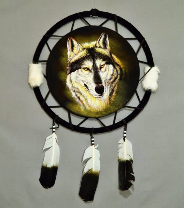 Wolf Face hand painted velvet shield features velvet rim, rabbit fur, leather lacing, plastic beads, and turkey feathers.