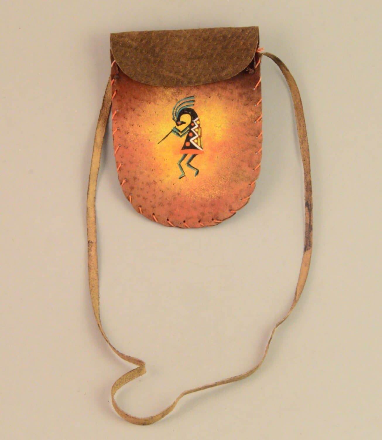 Hand painted Kokopelli on leather bag with strap. Size: Medium