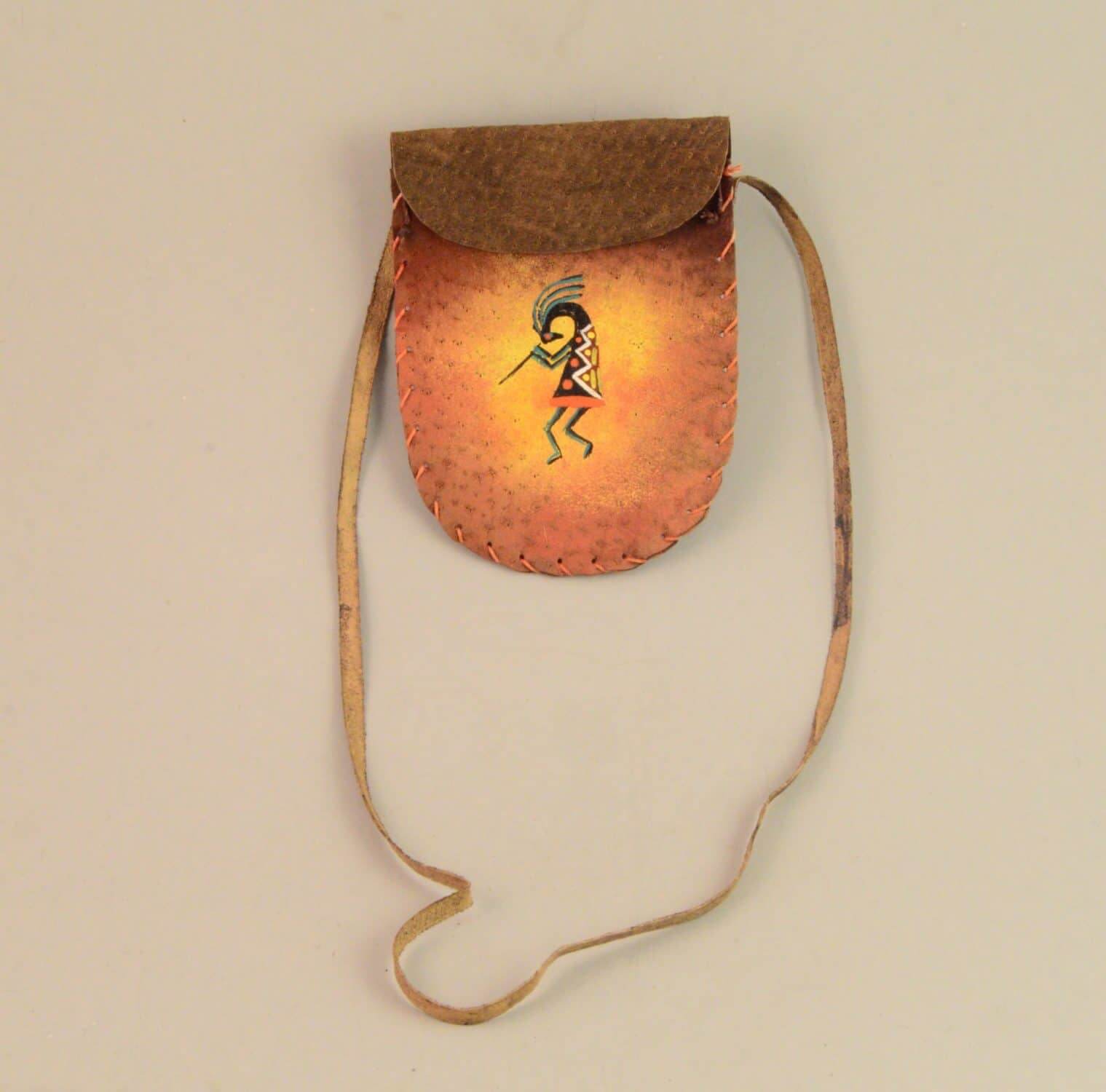 Hand painted Kokopelli on leather bag with strap. Size: Small