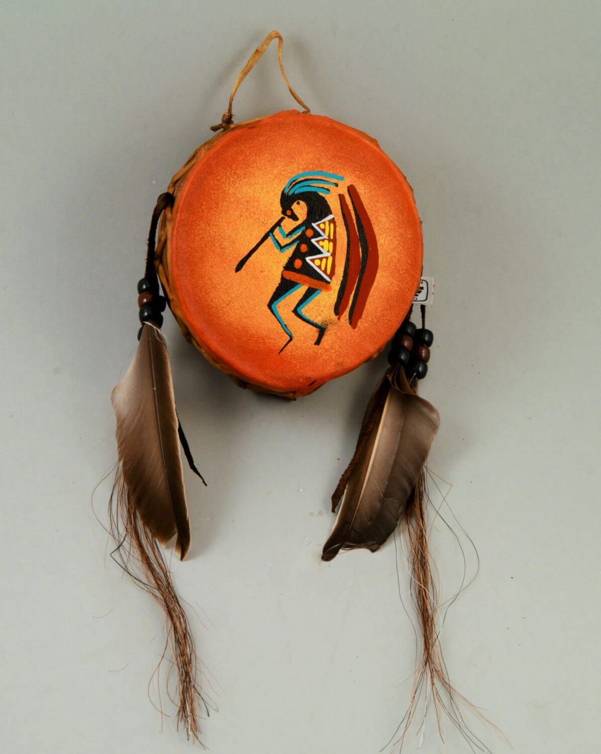 Beautifully hand-painted Kokopelli on the drum face. Features include leather straps, plastic beads and feathers. Size: 4″ diameter. Learn more by reading our blog post, The Legend of Kokopelli.