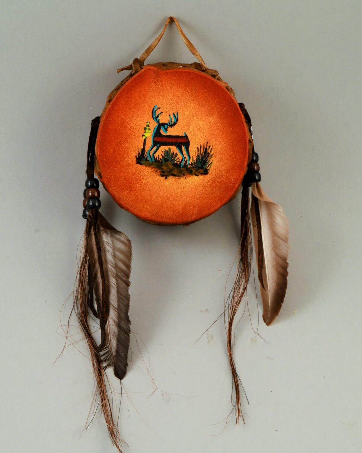 Beautifully hand-painted Three Deer on the drum face. Features include leather straps, plastic beads and feathers. Size: 4″ diameter.