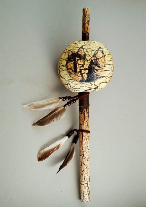 Two Wolves painted on Guaje (Gourd) with crackled detailing, wood handle, leather, plastic beads, and T-base feathers.