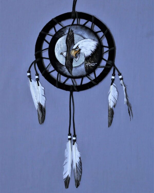 Eagles hand painted on a velvet shield. Features a wood frame, leather, plastic beads, and duck feathers.