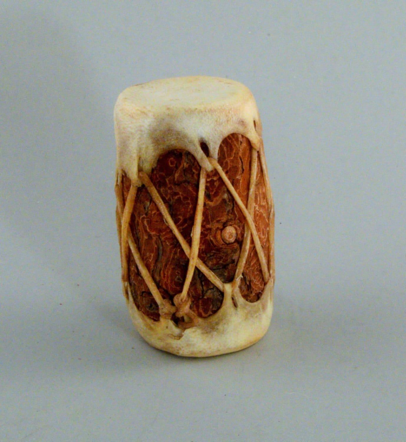 A hollowed-out wood trunk forms the basis for this rawhide covered drum. Each drum is unique in size and shape.