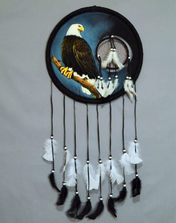 Sitting Eagle painted on velvet, featuring leather strips, plastic beads, and T-base feathers.