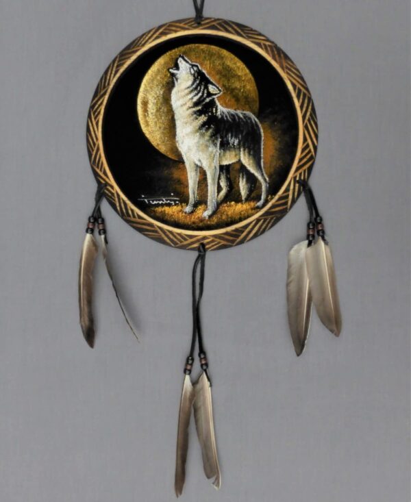 Howling Wolf hand painted on a velvet shield with a round wood frame. Features leather, plastic beads, and duck feathers.
