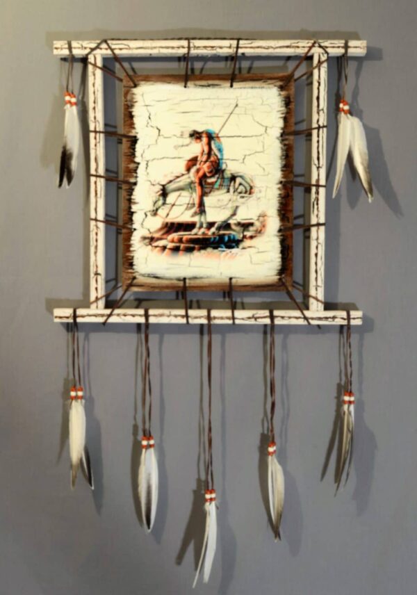The End of the Trail painted on wood with crackled detailing. Features a wood frame, leather lacing, duck feathers, and plastic beads. Size: 18″ x 20″. See our blog post, The End of the Trail History.