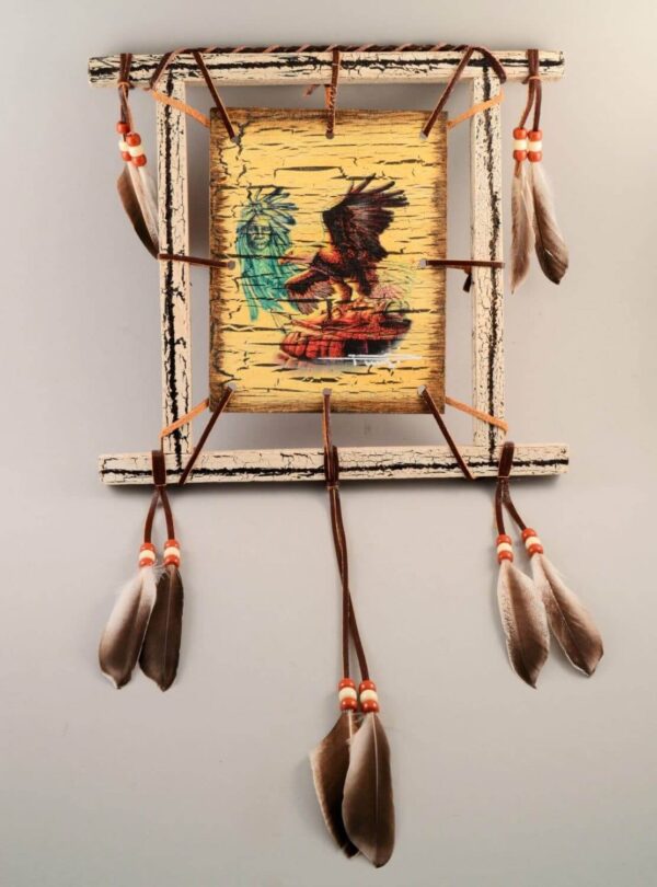 Eagle with Arrows painted on wood with crackled detailing. Features a wood frame, leather lacing, duck feathers, and plastic beads.