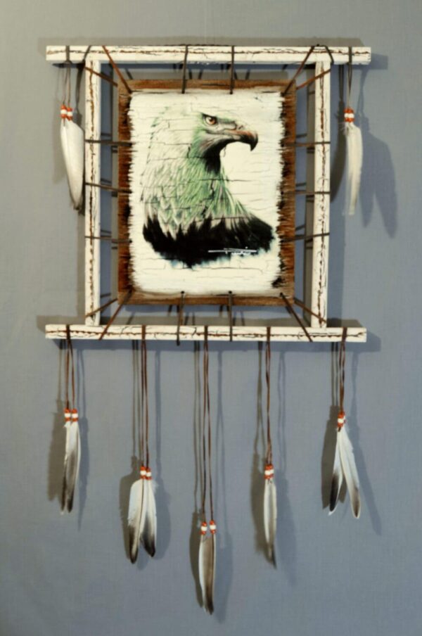 Eagle painted on wood with crackled detailing. Features a wood frame, leather lacing, duck feathers, and plastic beads. Size: 18″ x 20″